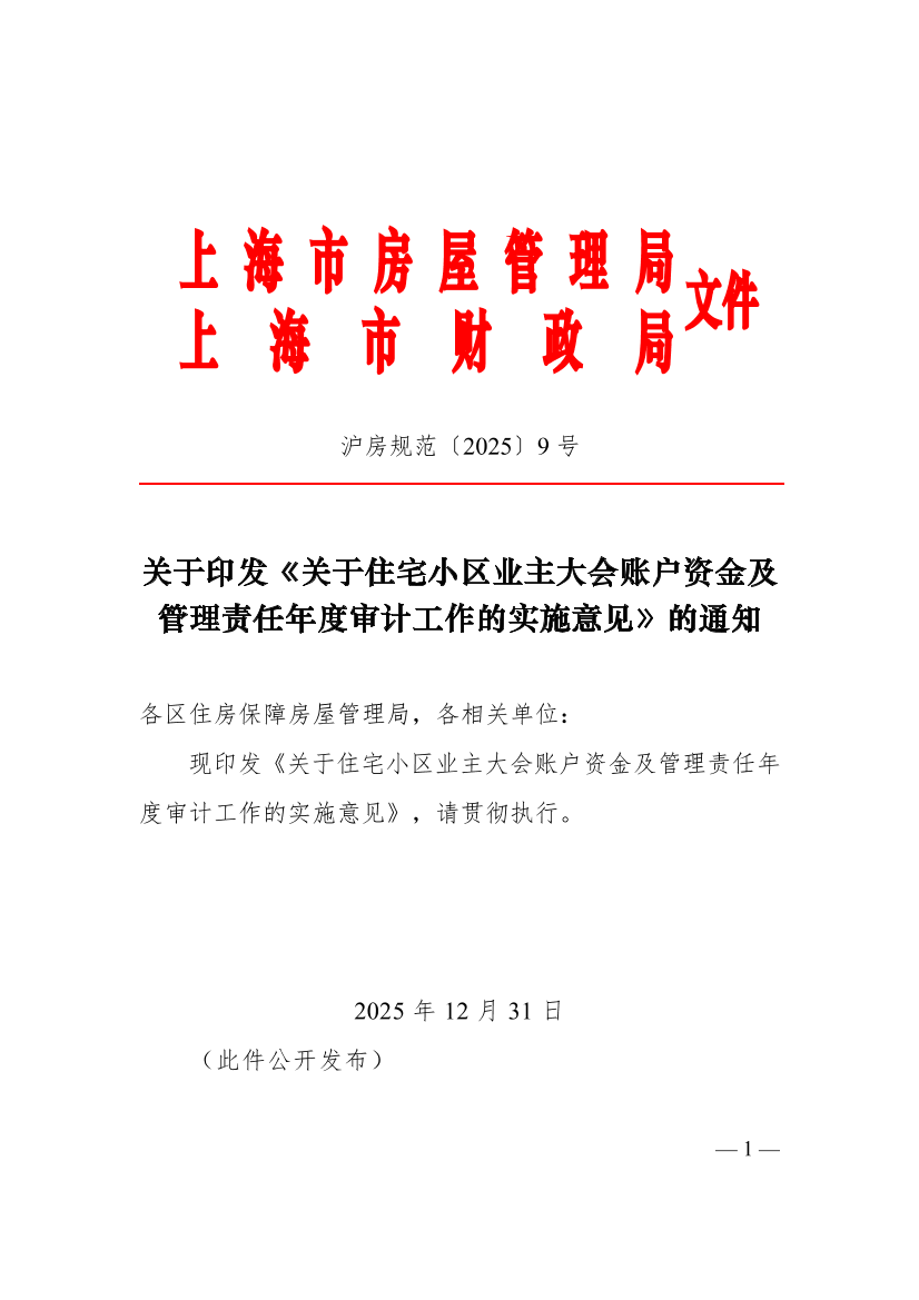 关于印发《关于住宅小区业主大会账户资金及管理责任年度审计工作的实施意见》的通知 ( 2026年01月16日 )
