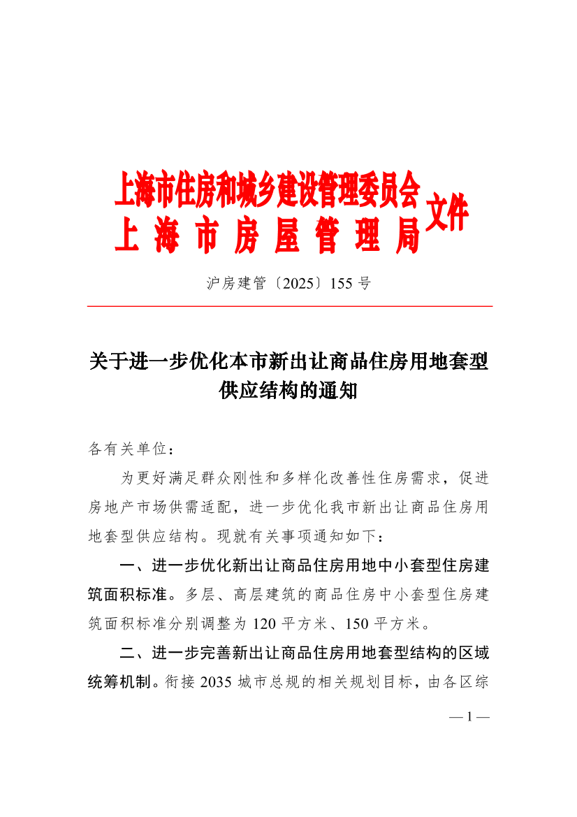 关于进一步优化本市新出让商品住房用地套型供应结构的通知 ( 2025年11月20日 )